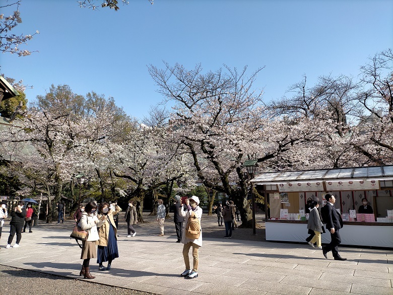 桜: 靖国神社は東京の桜の開花宣言の基準となる標本木がある場所でもあります。春には花見の名所として賑わいます。